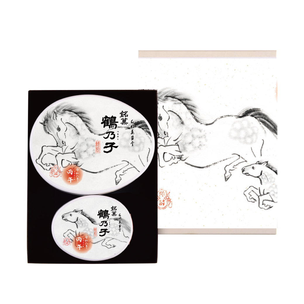 ふくよかな生地の中に風味のよい黄味あん、甘さをおさえたまろやかな味わいの鶴乃子は、博多で100年以上愛されづつける銘菓です。今年も、新進気鋭の博多人形師「中村弘峰」氏に、新年を迎えるのにふさわしい、”午”の画を描いていただきました。干支鶴乃子2個入りが子馬、干支鶴乃子4個入が親馬と、親子の馬に見立てています。