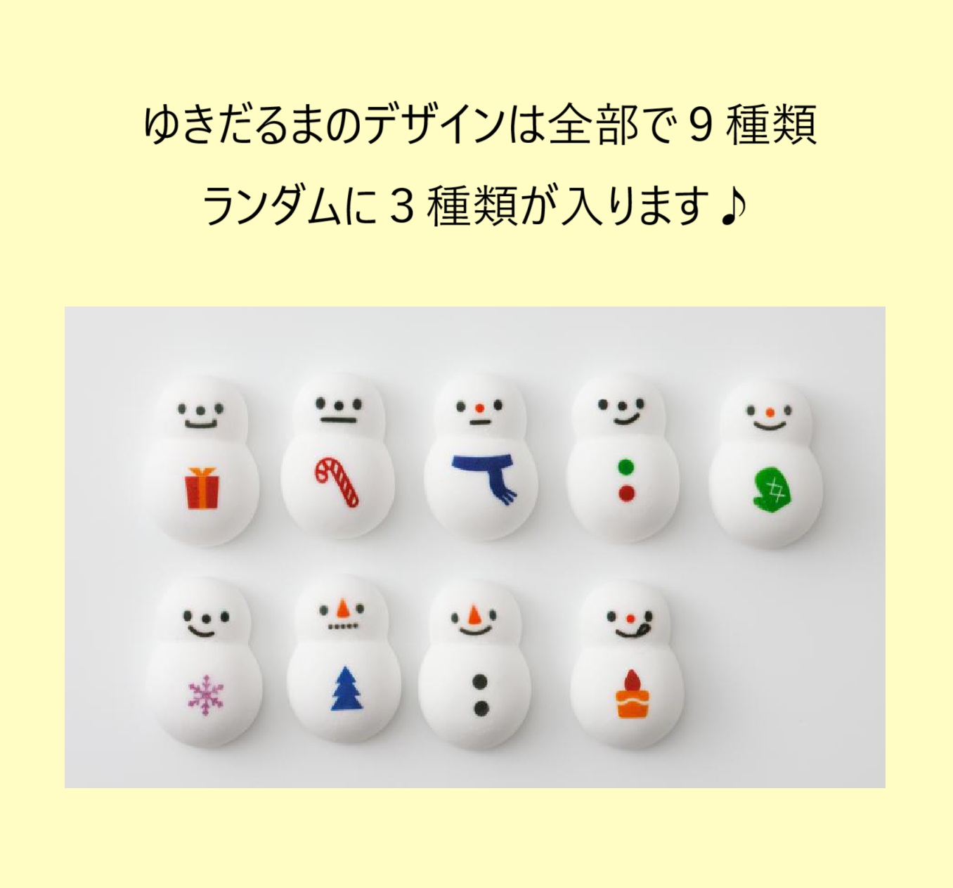 冬をモチーフにしたゆきだるまのデザインは、全部で9種類。9種類の中からランダムに3つ入ります。どれが入るかは届いてからのお楽しみ♪