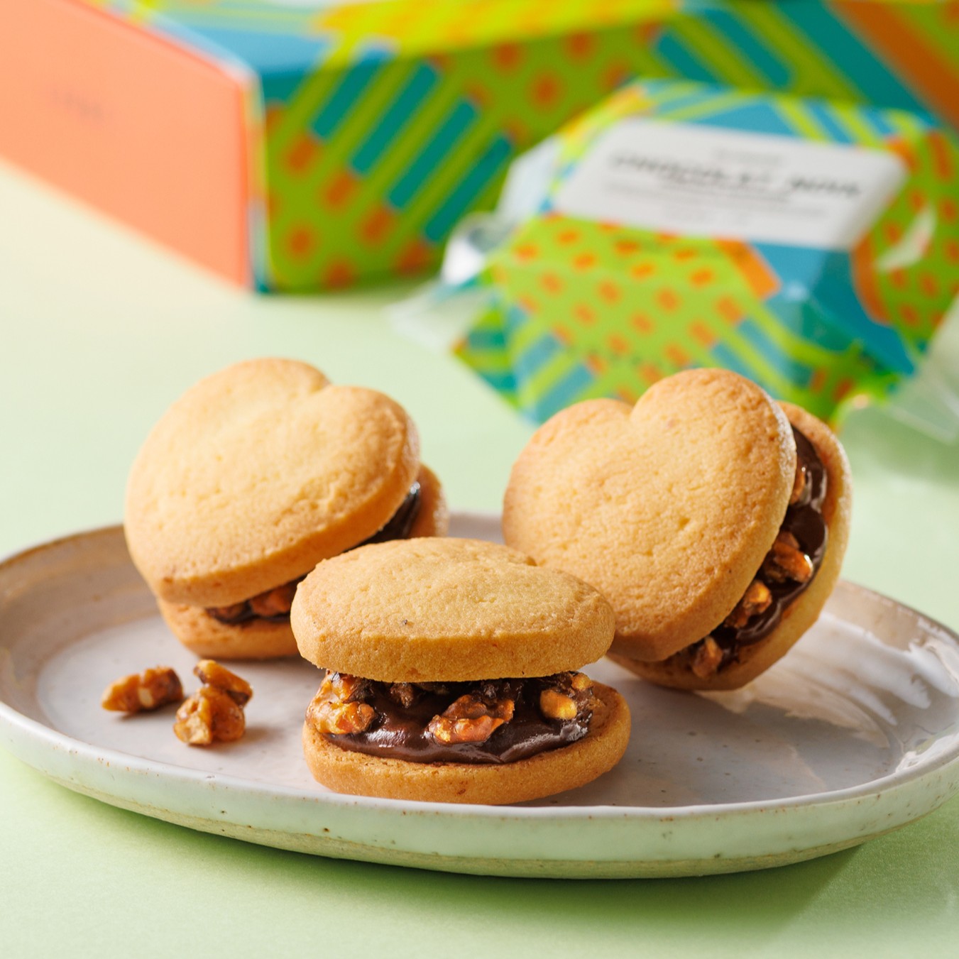 くるみをトッピングしたビターなショコラクリームを、ハート型のバタークッキーでサンドしました。ハイカカオの上品な香りと苦味、キャラメリゼしたくるみの食感が特徴的な限定のクッキーサンドです。