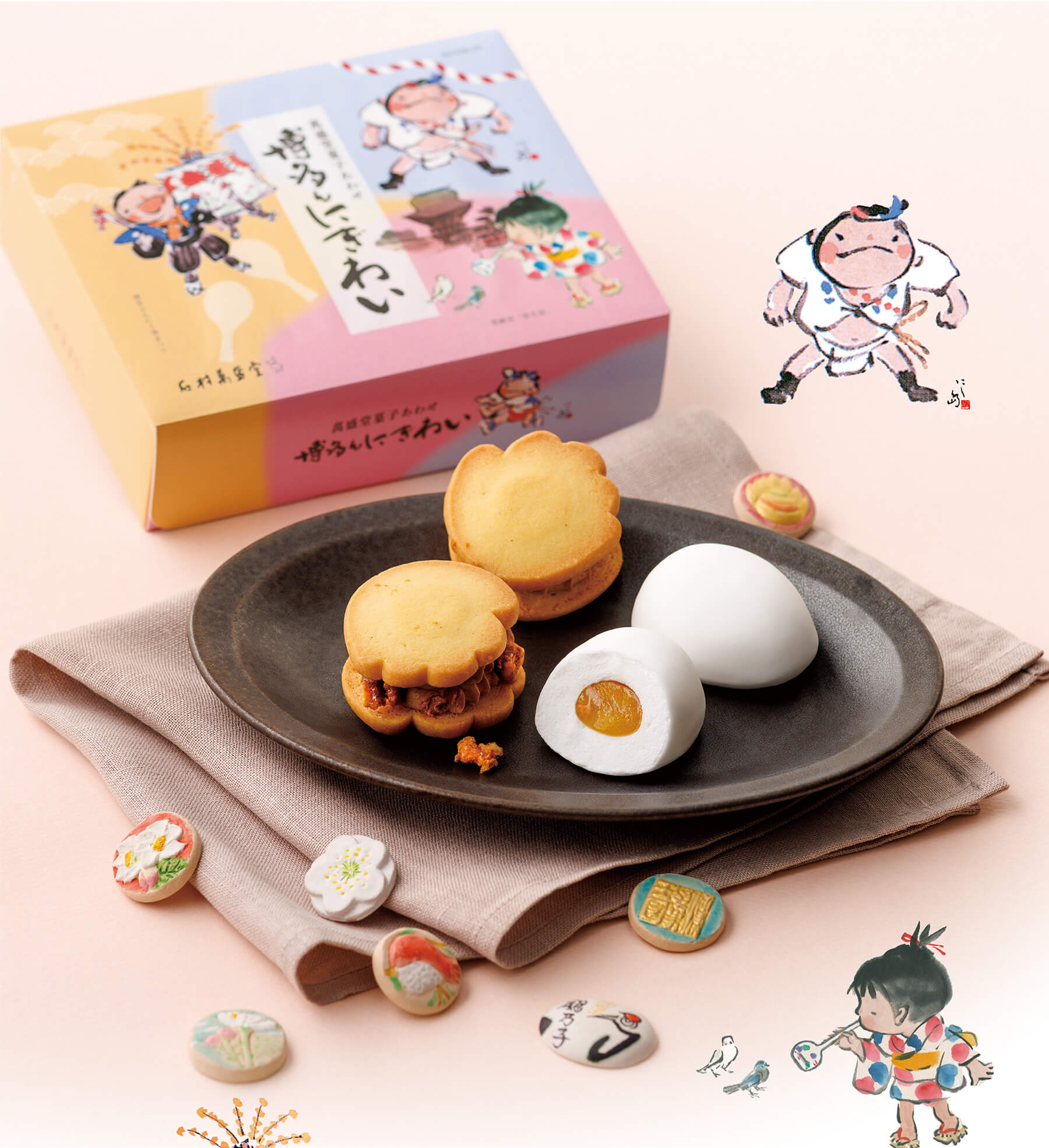 『博多んにぎわい』は、西島伊三雄さんのイラストで、そんな博多っ子の陽気さを描いた、明るく楽しいパッケージでお菓子を包みました。