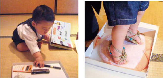 また、この時に子供の将来を占う意味で、筆、そろばん、おけいこ道具などを並べて、