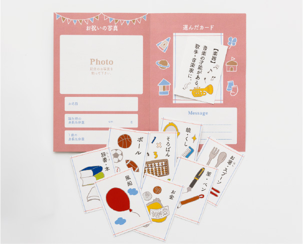 「選び取りカード」は10種類。お子さまが選び取ったものによって将来の職業や才能を占います。