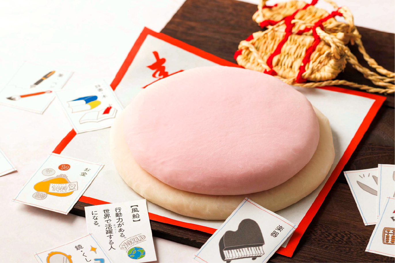 紅白二段の丸餅に、「選び取りカード」、一歳をお祝いする記念台紙を