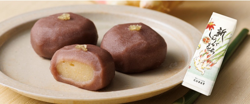 生姜の風味が効いたお餅をなめらかなこしあんで包み、甘煮した新しょうがを乗せました。