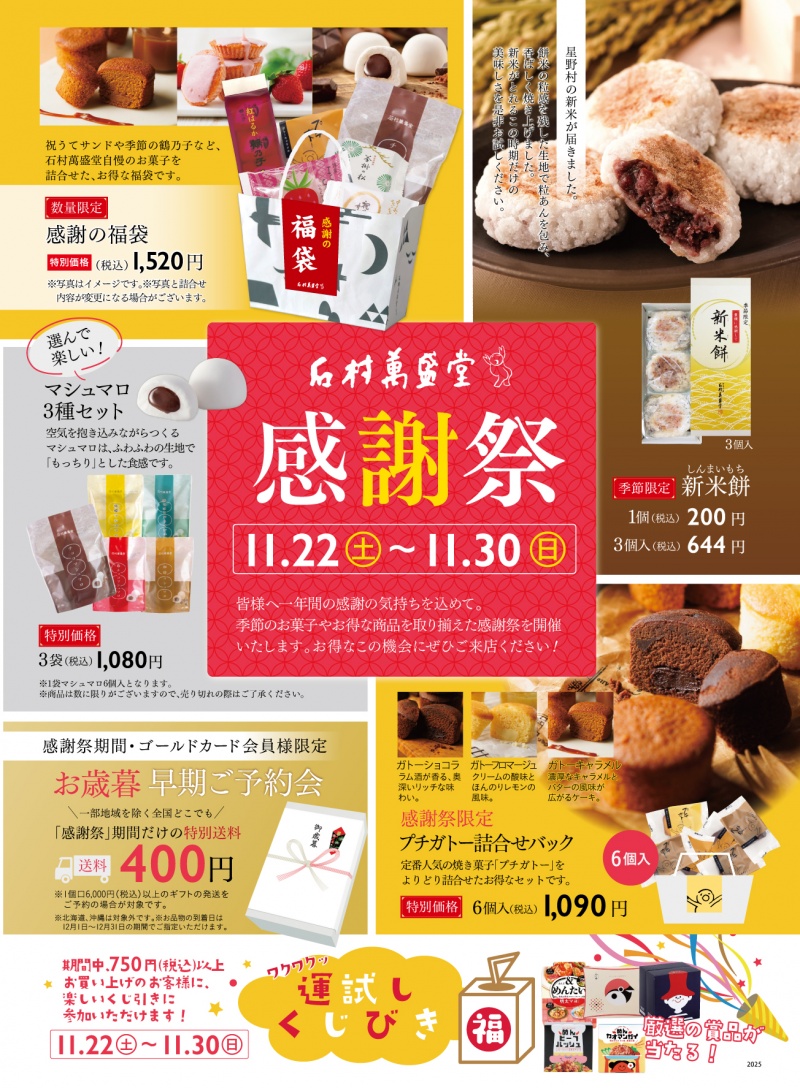 そんな創業記念に先駆け、11月22日~30日の期間、今年一年のご愛顧に感謝して、お菓子のいしむらでは【感謝祭】を行います。