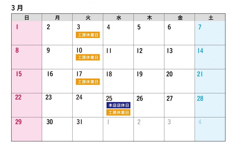 【2026年3月の店休日】