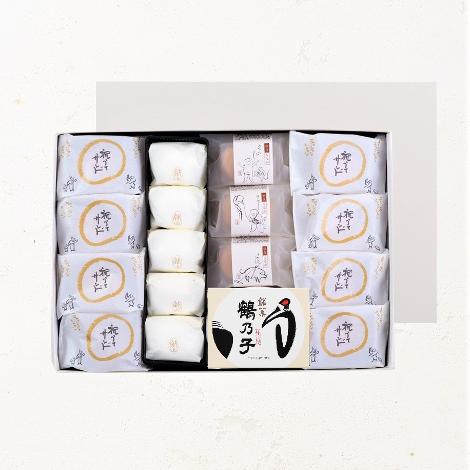 鶴乃子2個入1箱、献上鶴乃子5個、祝うてサンド4個、仙厓もなか4個 |
