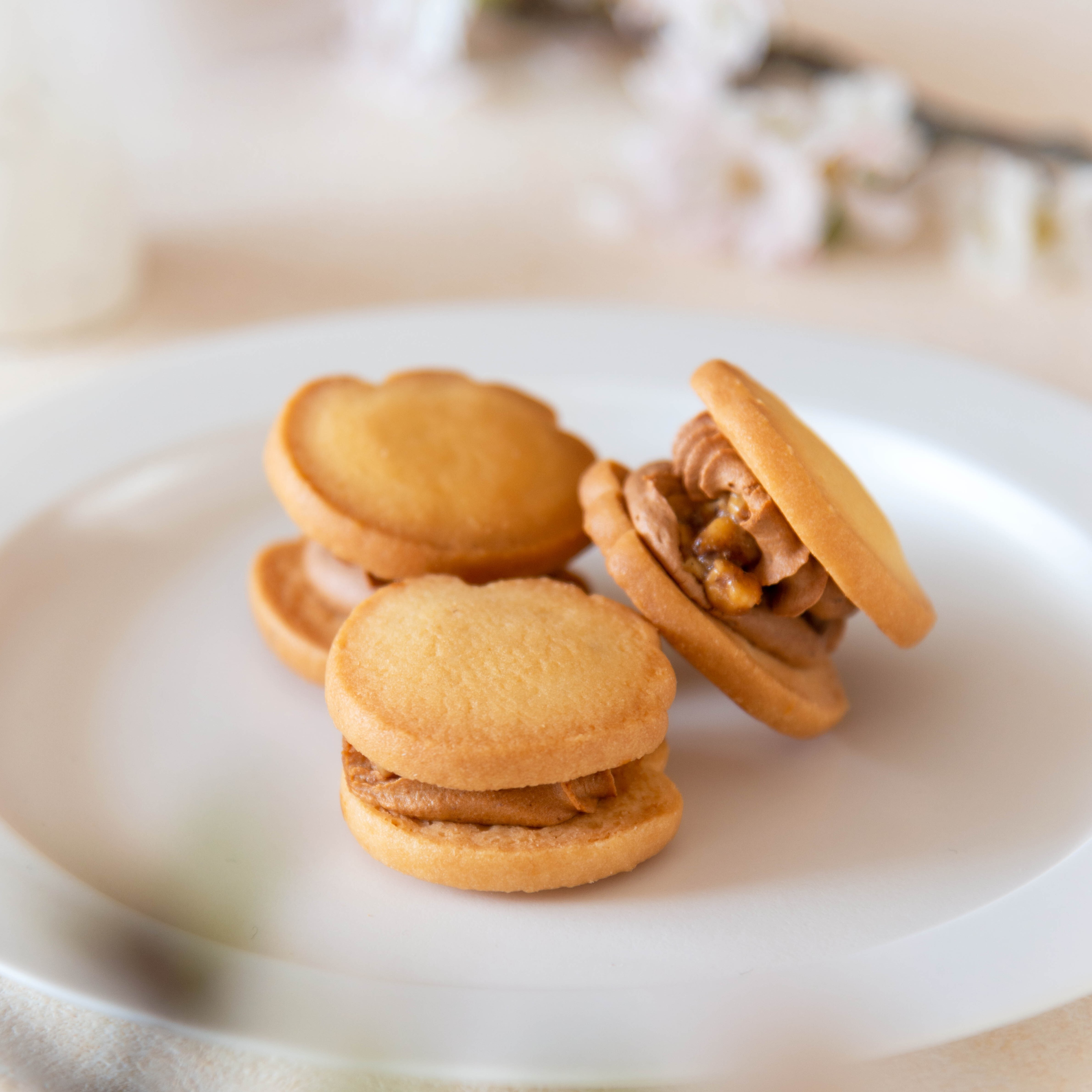 博多のお祝いの席に欠かせない風習「博多手一本」から誕生。手形のクッキーでキャラメリゼしたクルミとキャラメルクリームをサンドしました。