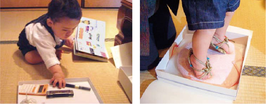 また、この時に子供の将来を占う意味で、筆、そろばん、おけいこ道具などを並べて、